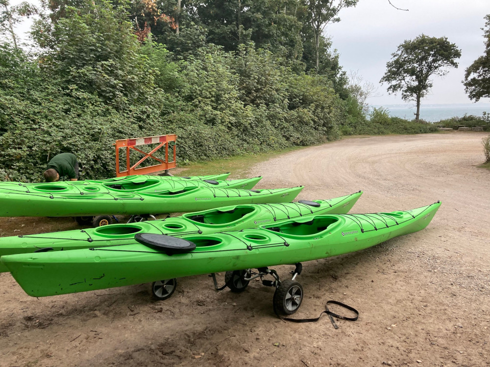 The sea kayak in question was seventeen feet long – half the length again of my car. I tried to imagine it strapped to the roof. The sit-on-tops are kept down at the beach hut but the sea kayaks are kept up on top of the cliff at HQ so once we were all dressed up, spraydecks and all, the first job was to put the boats on wheels and pull them down the access road to the slipway. Then we had to get them set up. Closed kayaks have footrests inside which need to be adjusted to the paddlers leg length, and then we had to practice putting the spraydecks on and pulling them off. You need to be able to do this with your eyes closed because when you’re upside down underwater, you can’t necessarily see what you’re doing. Find the edge, follow it round, grab the loop and pull. Our nylon non-stretchy decks were likely to open automatically under the pull of gravity but you have to know what to do in case they don’t. I was surprised but very relieved to learn that Elliott, our guide, had no plans to make us practise capsizing. As long as we knew the theory in case anything went wrong, the plan was to stay upright.