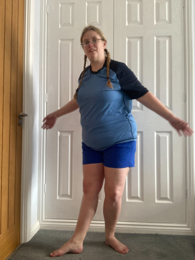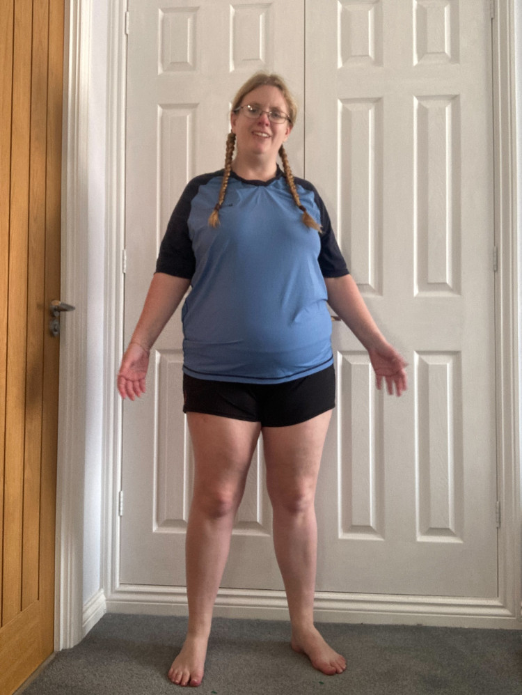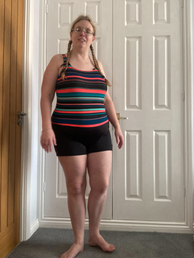 Instead, I wear a pair of swimming shorts. Obviously, the swimsuit is still underneath. My shorts are men’s swimming shorts from Primark in dark blue, which means they don’t really change colour or go translucent when they get wet.