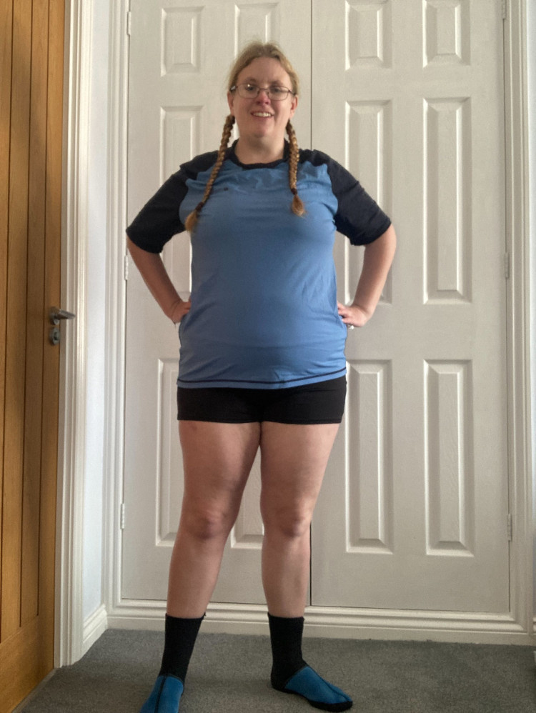 Next, I wear a rash vest, or swimsuit t-shirt. Again, it’s meant to be wet, it doesn’t cling as much as a normal t-shirt, it dries quicker and again, unlike cotton, it doesn’t steal my body heat. Mine is a bit oversized, partly because I don’t like it to be skintight but partly because I don’t like things touching my neck and I hoped the collar would be bigger. It’s not, so I’ve folded it back and pinned it with safety pins. They’ve been in place for about five years now and haven’t rusted so I consider that a result. The t-shirt is partly for sun protection on my shoulders, extra wind protection and partly just for covering the swimsuit, depending on the weather. Mine is an own-brand men’s rash vest from Mountain Warehouse – they don’t do the exact model anymore because it’s at least five years old but it has many similar ones in stock at the moment.