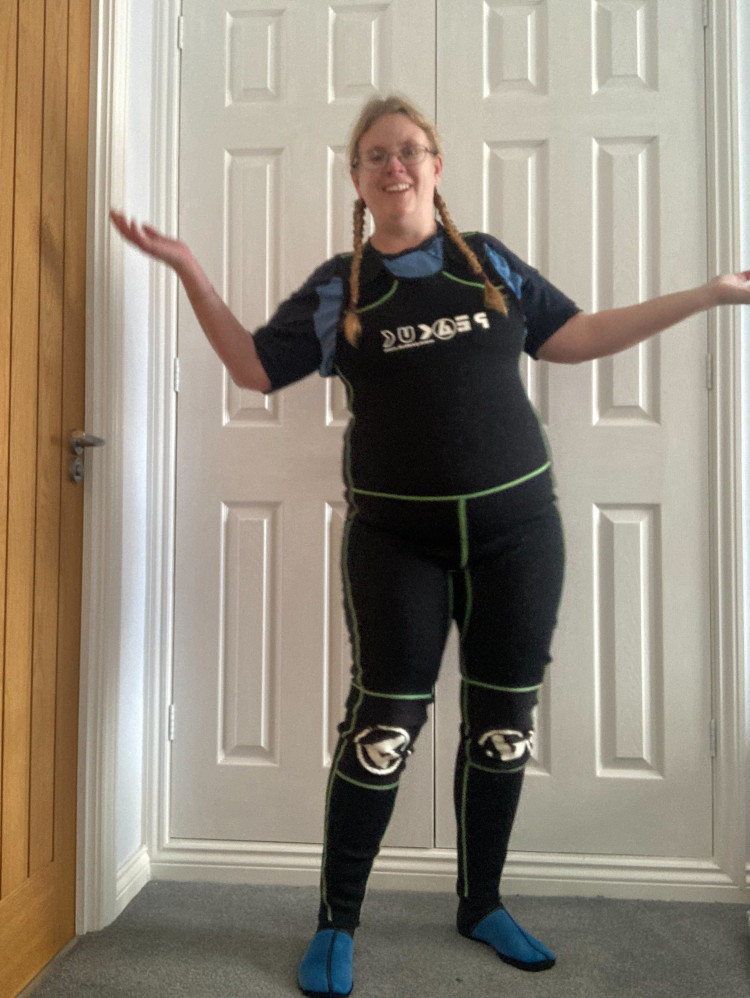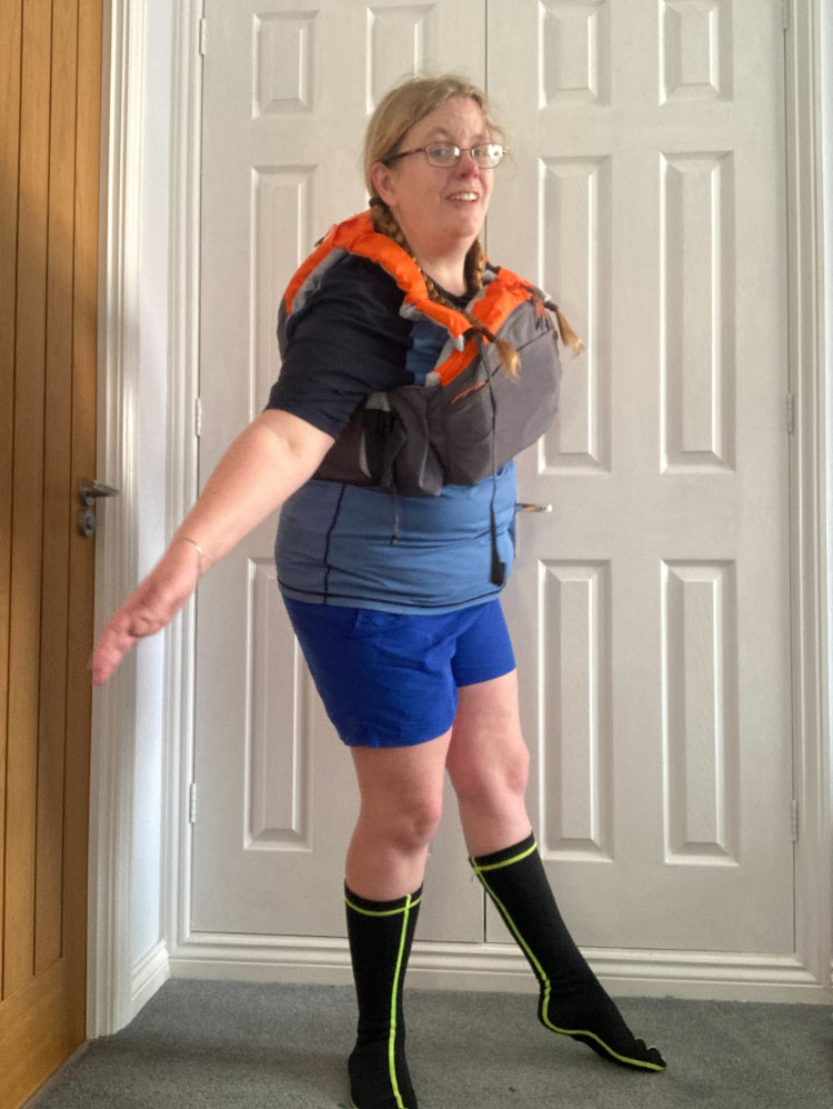 On top, I might wear the rash vest or I might not. The buoyancy aid covers everything that needs to be covered, to be honest, but I might wear the rash vest to keep the sun off my shoulders or because I suspect it’s not quite as boiling hot out on the water.