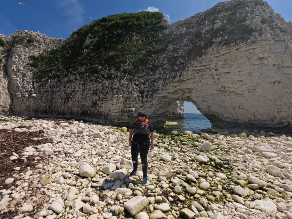 So I reached Old Harry. The beach around the famous formation varies hugely depending on the tide. Sometimes you can paddle straight through St Lucas’s Leap, the gap between the land and the stack, carried by wild water forced through the bottleneck. Sometimes you can land on the stones. And sometimes the stones are a big wide beach, like they were today. I crashed onto the rocks, got out and pulled my boat up a bit further. Nothing quite as embarrassing as having to phone the hire company to explain that you let the sea steal your kayak and now you’re stranded on a rock. I took a few photos, I met some people who’d paddleboarded out, I took their photos, they took mine and then, five or so minutes after landing, I was turning the kayak around, getting it off the rocks and jumping back onto it.