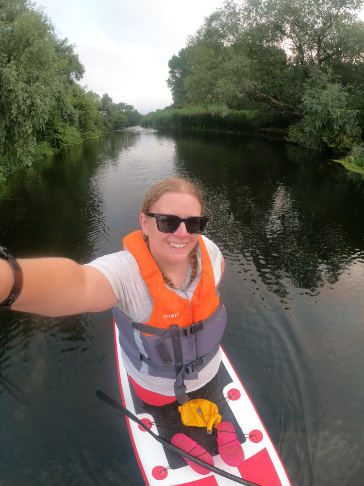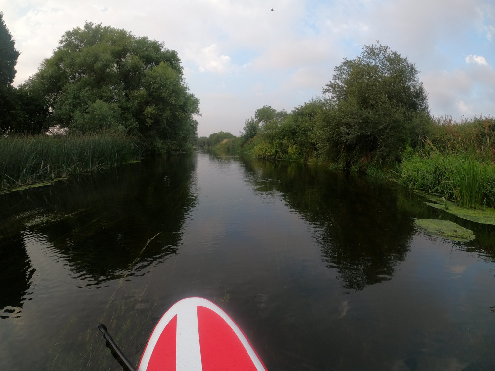 It’s a bit of a drive to hire a canoe or go out on the sea with a kayak, whereas thus river is only about a twenty-minute drive. I can spontaneously decide on nice summer evenings that I’m going out for an hour paddling on the river. Throw the board bag in the car, put on my filthy old grey t-shirt and swimming shorts, pack a drybag for my valuables and off I go.