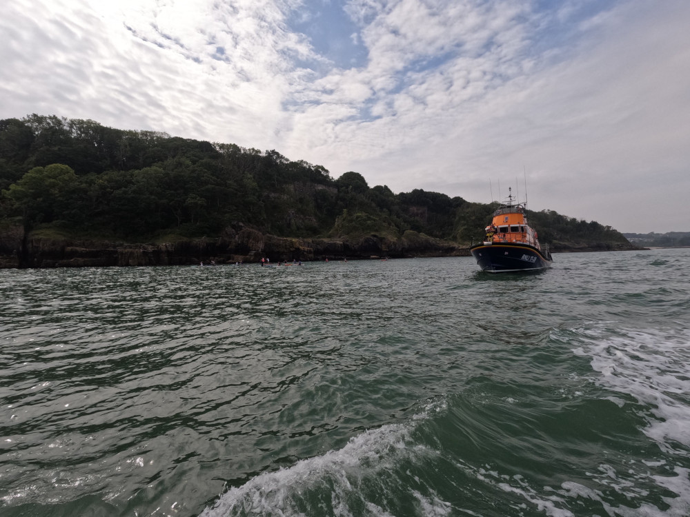 We followed the parade up to the final cove. We were called to pick up a suspected asthma attack at almost exactly the moment we were called to a puncture, so we passed the medical emergency to the RNLI, hung around long enough to make sure they were on their way and went to get the puncture. Not sure how but we ended up not getting the puncture, not then. Instead we led the parade around in a big circle so we could get into the cove behind them because we were the photo boat as well as the safety boat. We picked up various members of the Soak team running the event, sent the photographer off to shore for some drone photos, picked up the man in charge, sent him off again and there was generally half an hour of on-and-off chaos before we started back.
