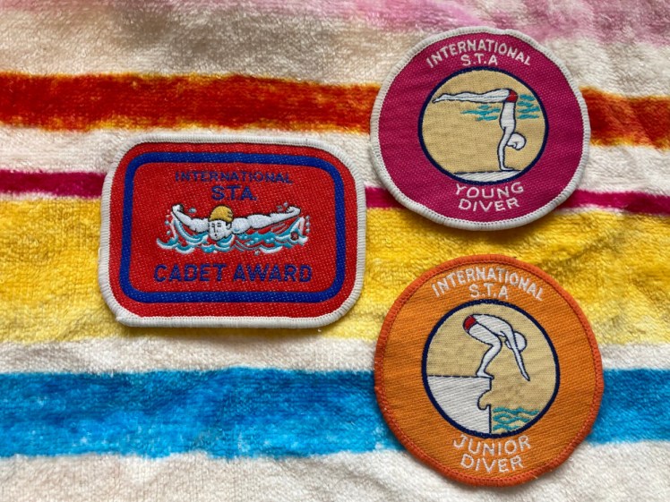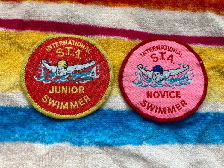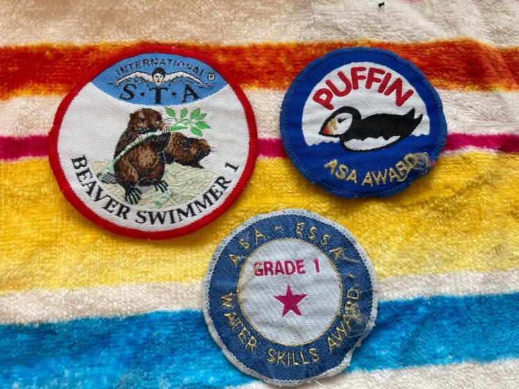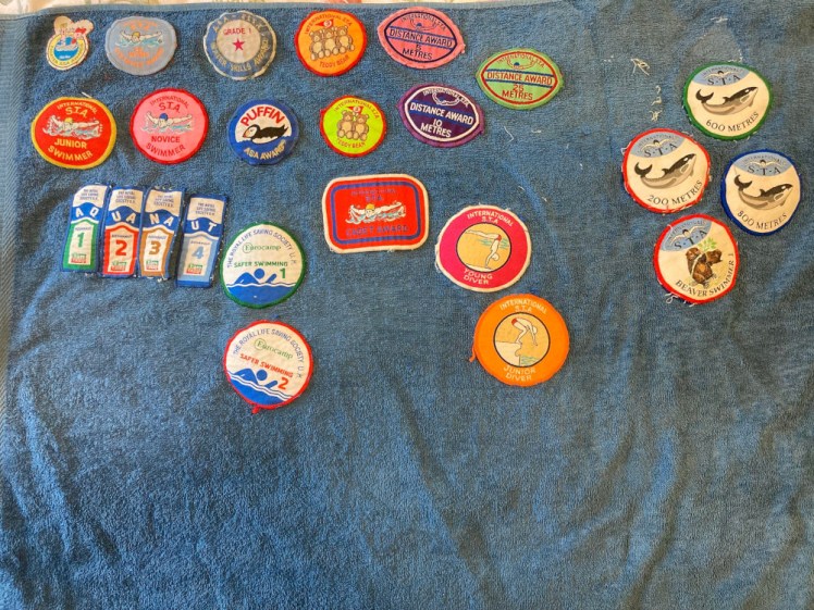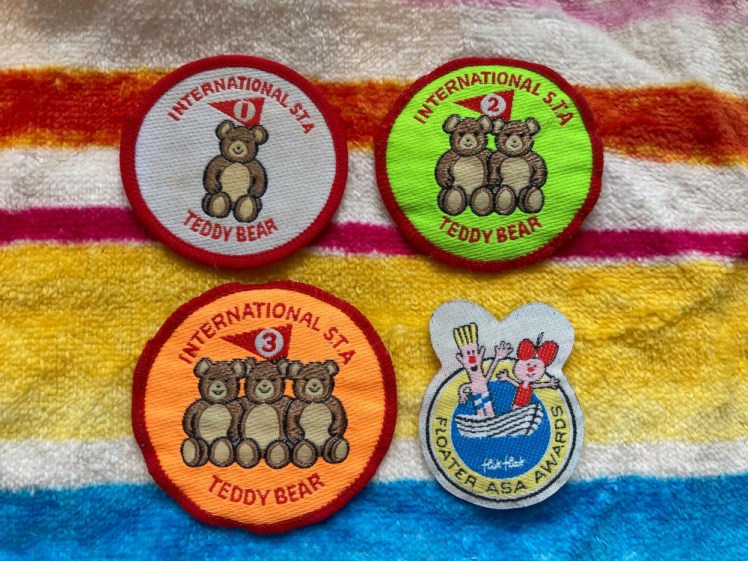 I think these Teddy awards are probably quite early ones. I’ve had Teddy 2 (lime green) and Teddy 3 (orange) on my towel but I don’t have Teddy 1 (white) so that’s an eBay. I assume I had it at some point and it got lost. I mean, these badges are not exactly expertly sewn on and you can see where one or two have come off. They seem to still exist, according to an STA Awards order form and are marked “early years”, as are Pool Frogs 1-3. I don’t have them but my sister does. ASA Floater is probably also an early badge.