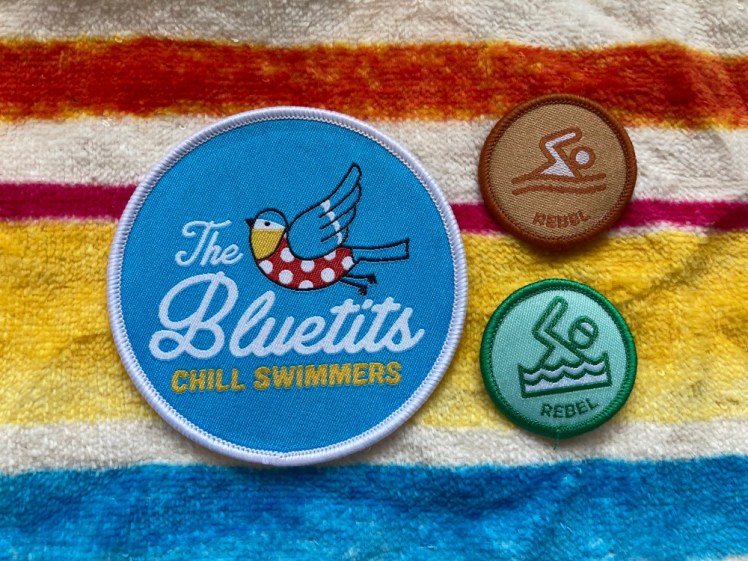 Then there are some more adult ones! I joined the Bluetits a few years ago to get comfortable in open water so I could maybe get comfortable falling out of my kayak, so I’ve got a Bluetits badge. I’m also a member of the Rebel Badge Club, which is a club that grew out of the Rebel Badge Book, a book of merit badges designed specifically for adults (and is now three separate badge books!). I did my Wild Swimming badge back in 2022, I think, so I’ve got that to go on my towel and I recently finished my Swimmer badge so I’ve got one of them too. I’d also like to get another Big Rebel Adventure 2025 badge for the towel but I’m going to wait until the Adventure is actually over in September and see if the price goes down – I don’t need a second swimming cap, I don’t need to be registered as an adventure participant and since the relay swim will be over, staff will no longer need to be paid and they may get sold off. We’ll see.