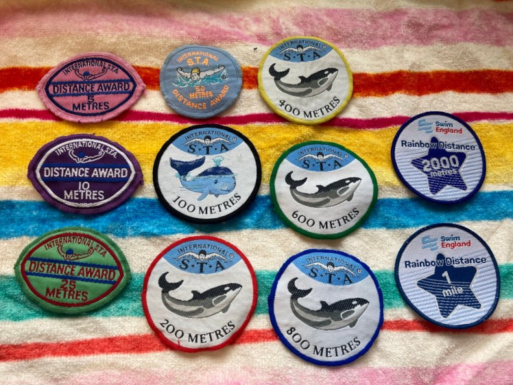 To add to that, I’ve completed my 2000m and my 1 mile as an adult. Swimming distance badges are surprisingly hard to buy if you’re not a qualified swimming teacher but I found a source. I also have a 3000m badge but it’s surprisingly hard to find the unlimited swimming session I’d need to earn that – I reckon two hours would do it but these days you have to book for specific sessions of usually only one hour.