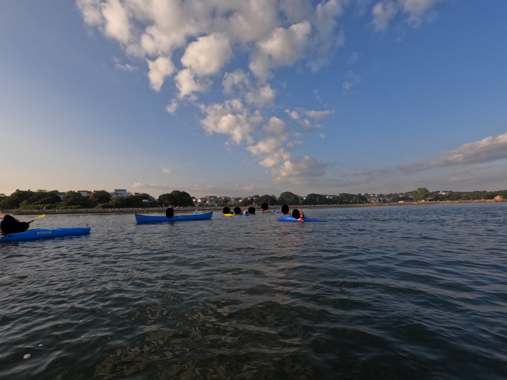 So we played ball all the way back to shore. The trouble was, the tide was going out almost before our eyes. I managed to stay afloat a lot further in than most of the girls but eventually, my kayak ran aground in the soft mud. I admit, that was the moment I nearly capsized. I got one leg out but when I went to stand on it and bring the other leg with me, the silt in the water confused my brain. Not being able to see how deep the water was, I suddenly couldn’t get my other leg out without falling over. I half-fell back into the boat, assisted by Caterpillar, got myself back in properly and then had another go. That worked, as long as I closed my eyes at the critical moment. Then we waded back to shore through two inches of thick, black, oily mud to the shore. I did have the sense to retrieve my sling from Ilse’s boat before it turned into eight feet of muddy string but the boats got muddy, my legs got muddy, my hands got muddy and by the time we were cleaning them, we discovered the extent of the mud on the boats.