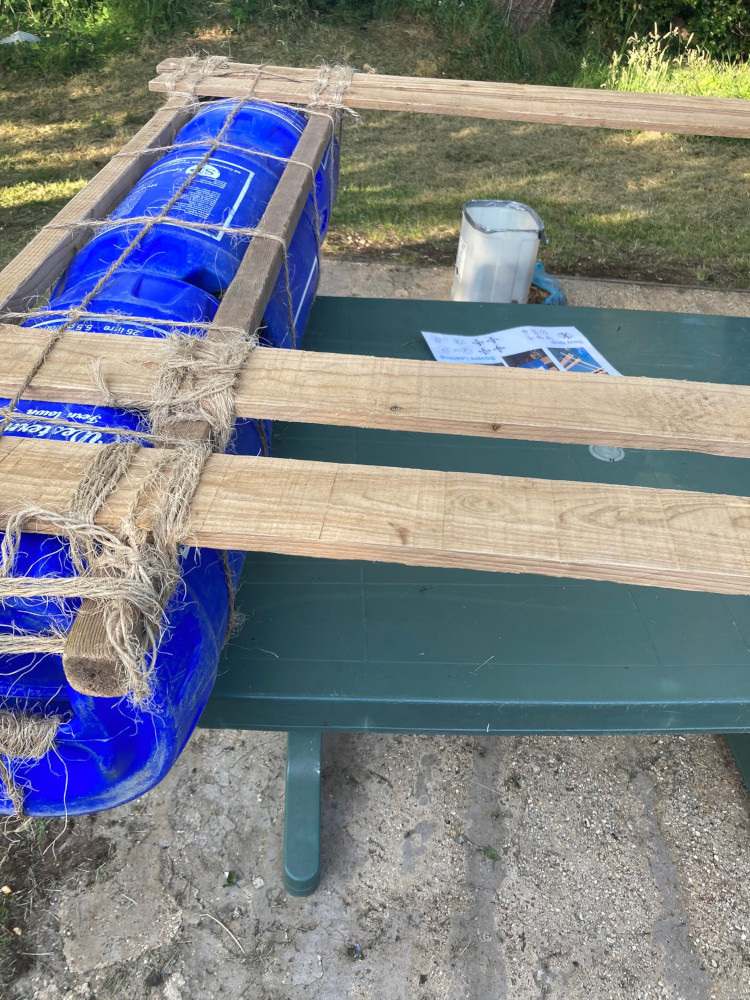 The boathouse people have also realised that since they do their fair share of the work in constructing rafts, it’s better for their backs to do it on the plastic picnic tables that usually live in the dry room. It’s a little awkward and maybe we shouldn’t have put them side by side on the concrete outside the back door but we got around somehow. Basically, it’s lash four planks together in a square, with an extra plank on two opposite sides to provide a kind of “track” for the barrels. When you’ve built the frame, lash the barrels to it. Some of the Guides eventually got quite into their square lashing but I’m not sure anyone mastered the clove hitch – not helped by being shown at least four different methods of tying one by three different adults.