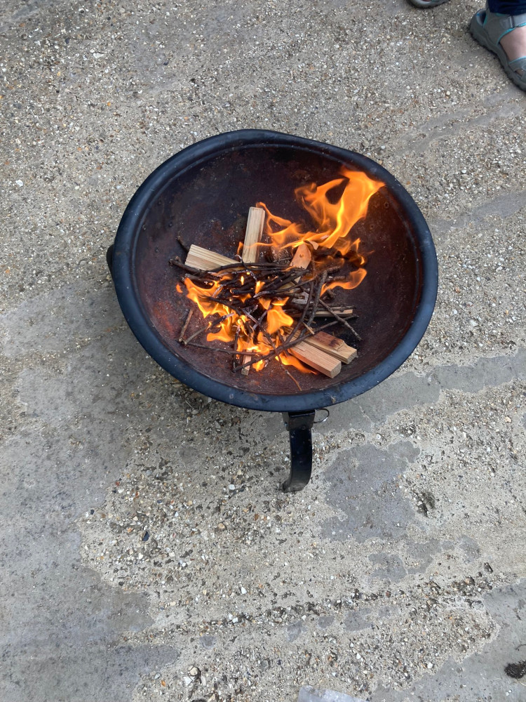 That half an hour gave us the time to fire up the firepit. If groups want, we can do some actual cooking but for tonight, toasting some marshmallows was all we needed it for. We needed enough fire to have enough embers for the entire group to keep toasting for as long as they wanted. Butterfly had some firewood – both a bag of kindling and a bag of small logs – and we had some firelighters. The problem was the matches. This matchbox must be older than I am and the striker panel was almost completely worn away. If we could just put a match to the firelighters, we’d be good but getting the match lit in the first place was hard and there was just enough breeze to make it difficult to get to the firelighters. We resorted to doing it in the doorway of the boathouse, just to get out of the breeze. There we had to balance getting the fire lit enough to be able to carry it out into the wind and not getting it lit too much to set off the smoke alarm, especially since it’s right up in the ceiling where none of us can reach it.